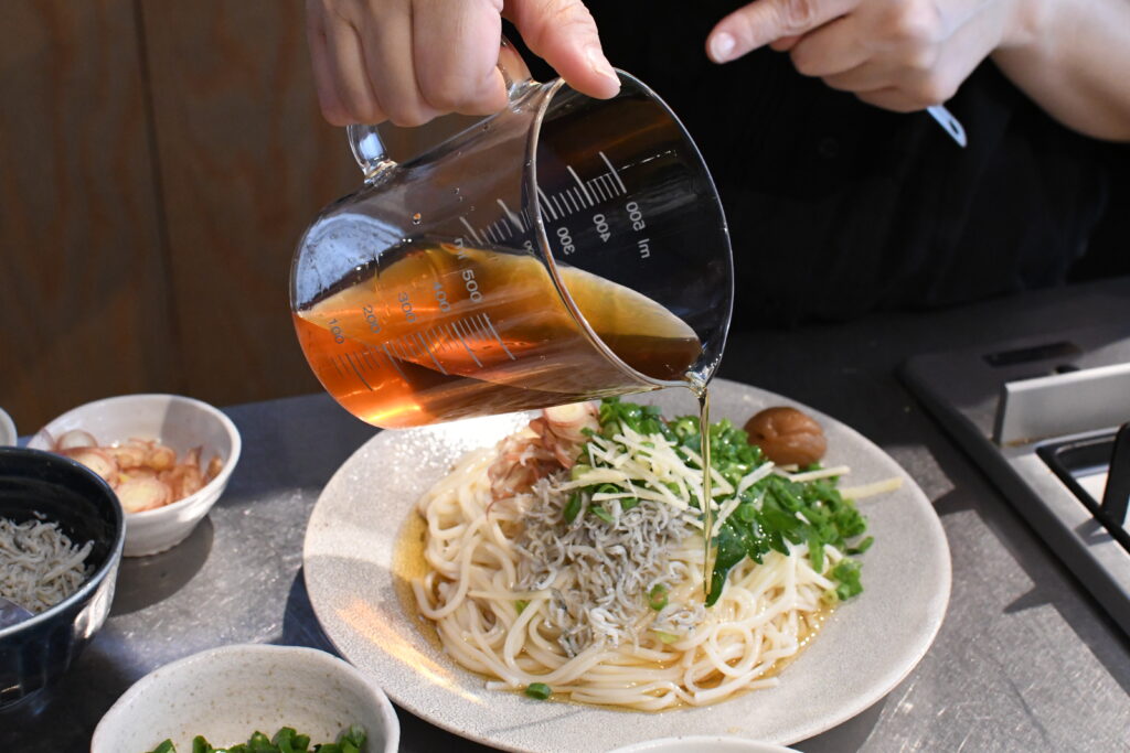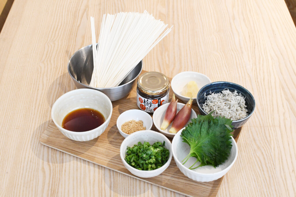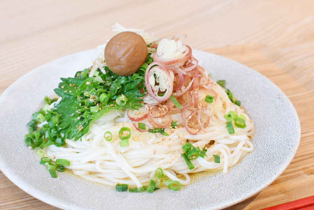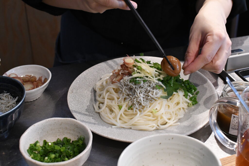 4.3を器に盛り、2と青ネギ、しらす、大葉を盛り付け、最後に梅をのせて、ごまをふる。