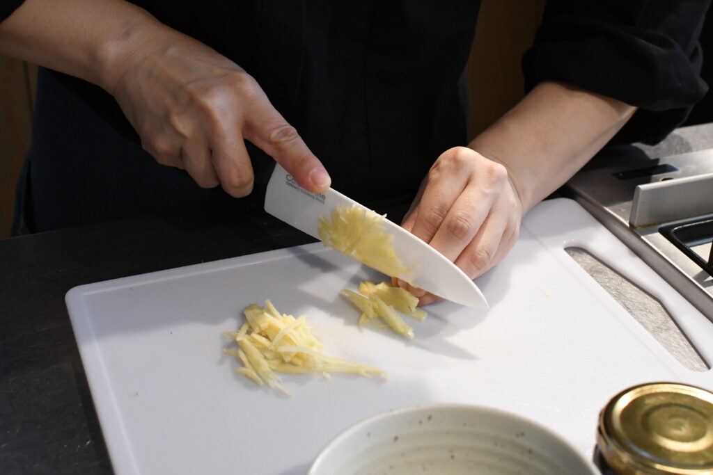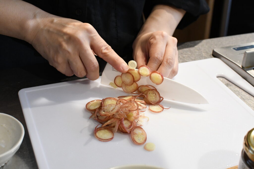 2.茗荷と薄い輪切り、生姜は千切りにする。