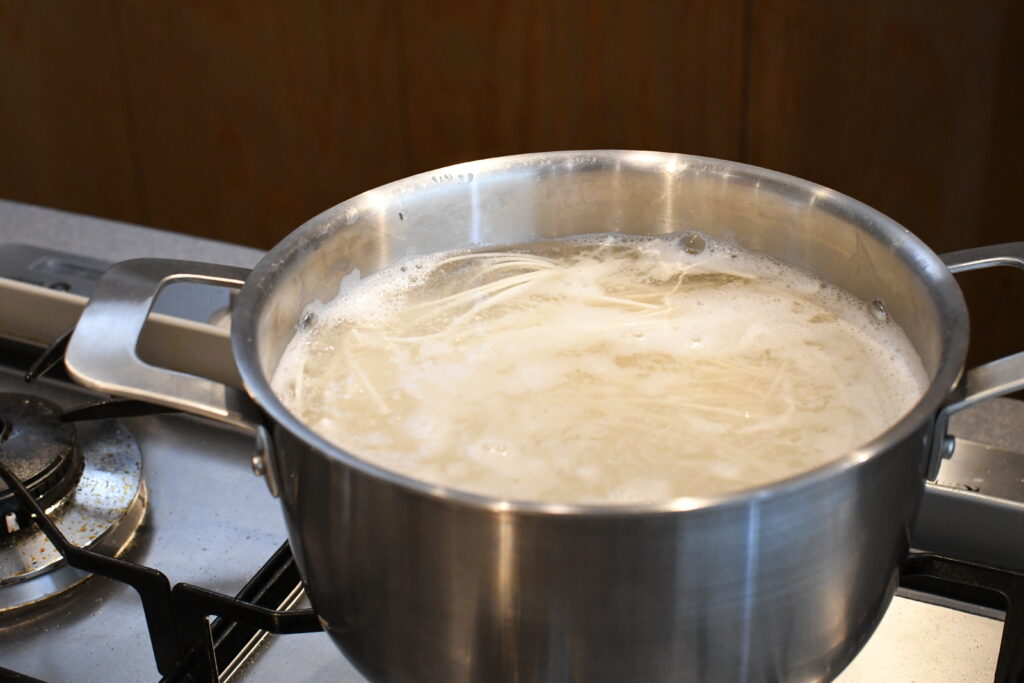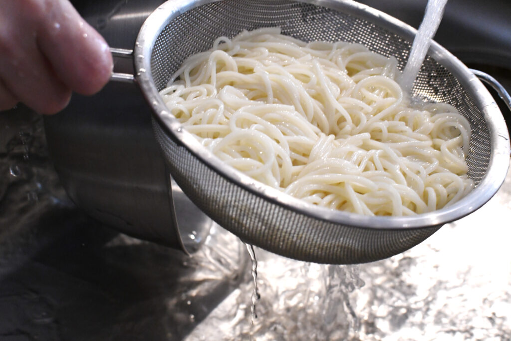 3.うどんは茹でたら、冷水にとり、しっかり洗いしめる。